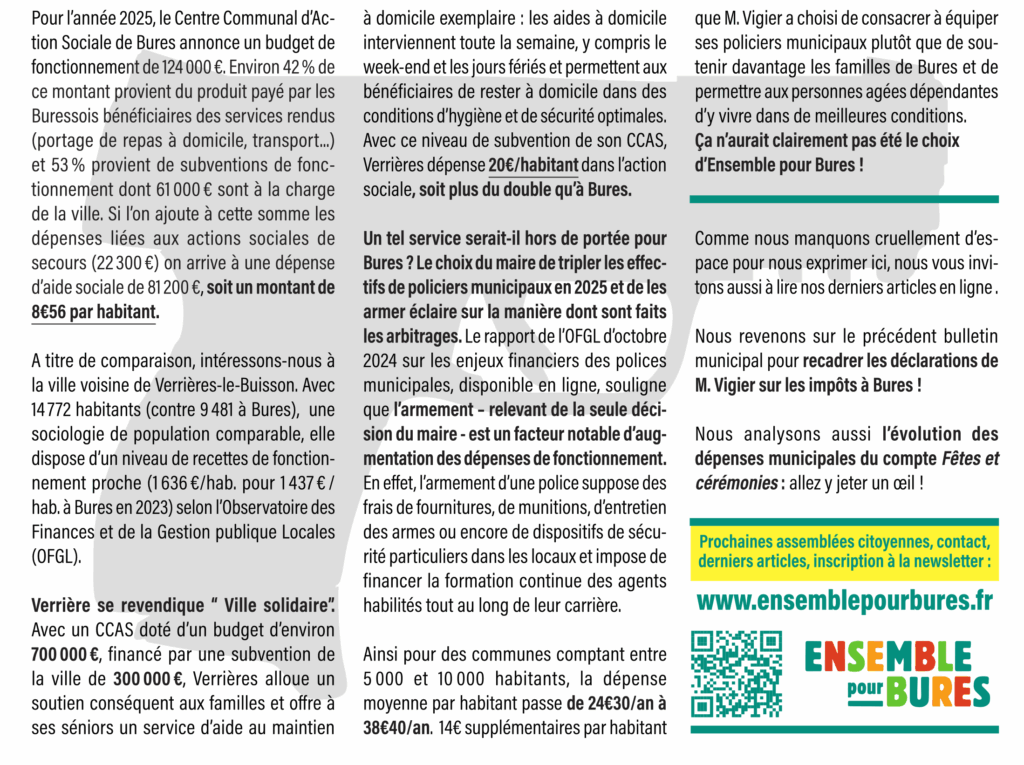 Bures choisit d’armer ses policiers, pas d’accompagner ses séniors Publication publiée :04/02/2026 Post category:Non classé / Santé / Sécurité / Vivre ensemble Commentaires de la publication :0 commentaire Read more articles Article précédentTransition écologique : allons-y sans faux-pas ! Vous devriez également aimer Relations occultes 03/06/2021 Conseil municipal du 29/02/2024 – Résumé des débats sur le projet de terrain synthétique 20/03/2024 Table ronde : Aménagement du territoire et climat 25/05/2021 Laisser un commentaire Annuler la réponseCommentEnter your name or username to comment Enter your email address to comment Saisir l’URL de votre site (facultatif) Avertissement : ce formulaire peut uniquement être utilisé si JavaScript est activé dans votre navigateur. Δ