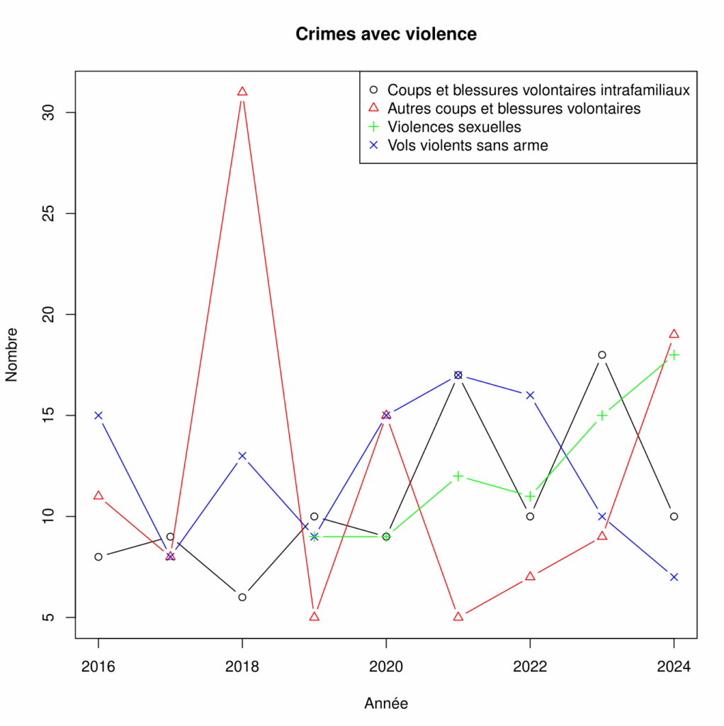 Il y a toujours trop de victimes de violences mais comme le montre les statistiques de la police concernant les procédures annuelles instruites pour des faits de violences à Bures-sur-Yvette entre 2016 et 2024 (figure de gauche), seules deux catégories, les coups et blessures à l’intérieur de la famille et les violences sexuelles augmentent à Bures-sur-Yvette. Concernant les drogues, seul l’usage de stupéfiant à fait l’objet d’une douzaine de procédures annuelles entre 2016 et 2018.
