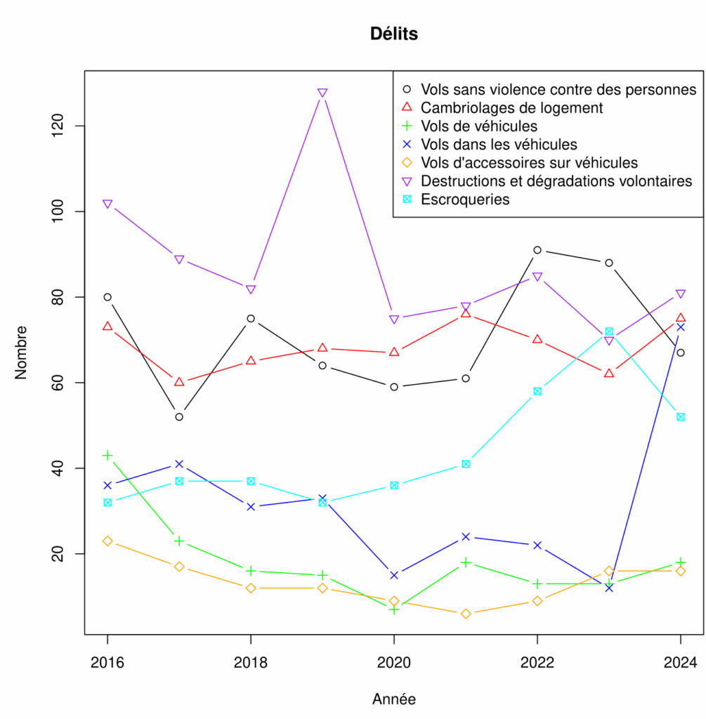 Moins graves mais potentiellement fortement anxiogènes, les différentes atteintes aux biens (figure de droite) ne présentent pas non plus d’augmentation sur plusieurs années sauf pour les escroqueries.